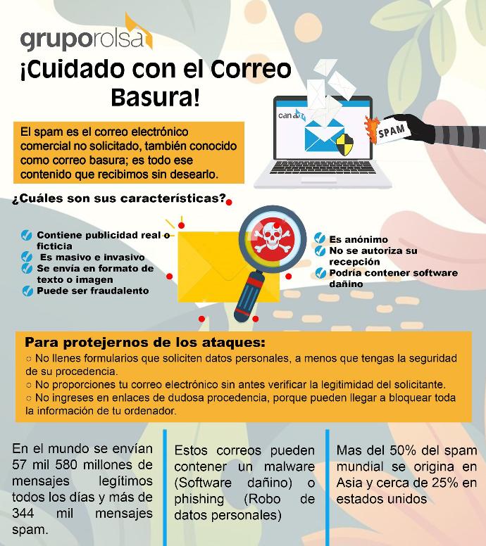 Spam son grandes cantidades de correos o envíos publicitarios, que se realizan en Internet. Los correos Spam son envíados a millones de cuentas de correo sin haber sido solicitados. La mayoría de los correos tienen una finalidad comercial y son de los siguientes tipos: